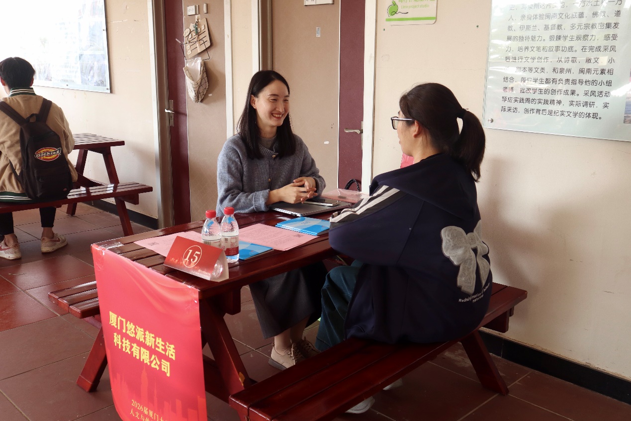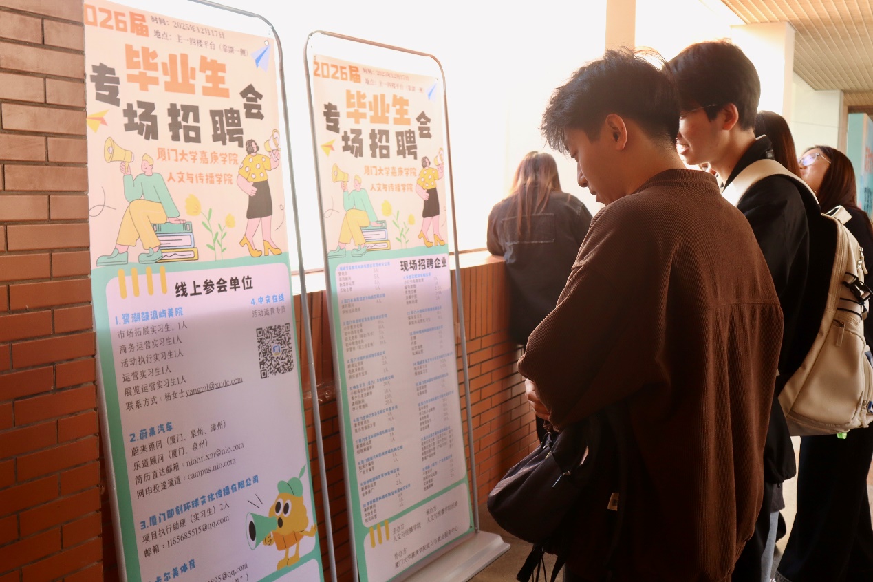 12月17日下午,由厦门大学嘉庚学院实习与就业服务中心进行指导,人文与传播学院主办,人文与传播学院团委承办的“筑梦文传,‘职’等你来”人文与传播学院2026届毕业生专场招聘会在主一四楼靠湖平台举办,厦门美图之家科技有限公司,厦门市思明区新东方教育培训学校等18家企业来到现场与毕业生们进行交流沟通,鹭潮鼓浪屿美院、蔚来汽车等6家企业在线上为我院毕业生开放招聘申请。
