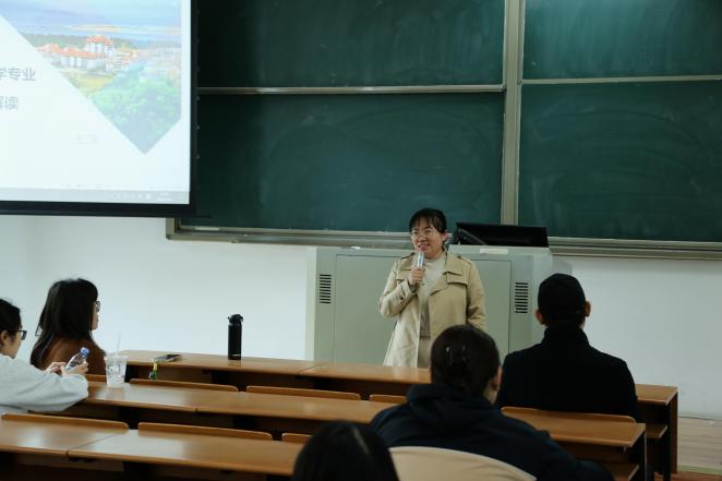 在同学们对专业发展有了清晰认知后,王萍主任对汉语言文学专业人才培养方案进行全面、细致的讲解。她首先明确专业培养德智体美劳全面发展,兼具扎实中文功底、跨学科视野与综合实践能力的复合型人才的目标,指出专业就业并非“独木桥”,除考公考编考研外,还有更多的选择,更广阔的发展空间。除课程设置的模块,她还介绍了实践课的具体安排,包括各学期实践周任务、毕业论文与毕业实习的时间节点,鼓励新生参与大创项目、学科竞赛等双创活动。此外,王萍主任强调专业学习要兼具情怀与行动,在人工智能时代更要深入读书、独立思考,重视同学间的交流合作与社会实践,积极参与各级各类竞赛、读书分享、教学技能竞赛、暑期实践等活动,在实践中锻炼能力、找准方向。她还介绍了专业雄厚的师资力量、完善的实践基地与毕业实习安排,让转专业的同学们对专业教学资源有了充分了解。